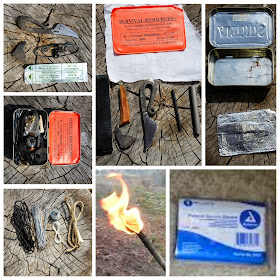 I disliked my cutting tool options in the original kit and have been looking for a multipurpose cutting tool that would fit in an Altoids tin ever since.  I recently picked up the striker knife that is on the top of the picture (and is featured in the video below) to act as a fixed blade knife, ferro rod scrapper and flint/steel fire starter. I believe this addition to the kit increases the kit 100x in efficiency as a cutting tool is what you need the most for long-term survival. Below the knife you will see a hunk of flint which can be napped into a sharp point, a wire saw (see me use it as a bow saw here- LINK) and a sterile scalpel. While its not as good as having a 4"+ fixed blade knife it's better than nothing and i have a fixed blade knife on me nearly 90% of the time. I did highly consider the CRKT Minimalist for this function but thought a striker knife was a better fit as it is more multipurpose and bomb proof.
